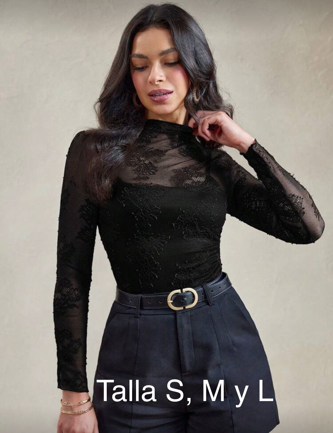 BLUSA ELEGANTE DE ENCAJE NEGRO TRANSPARENTE Y MALLA TALLA: S-M-L