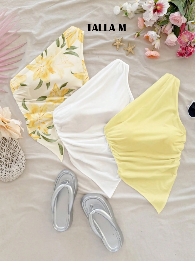 blusa de una sola manga amarilla floreada, blanca, amarilla