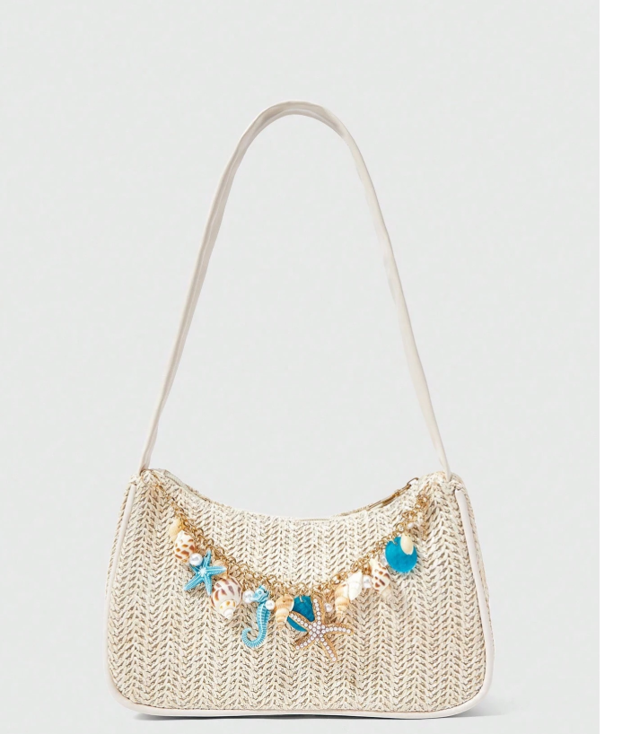 BOLSA BEIGE CON DISEÑO ENFRENTE COLOR AZUL EN CADENA