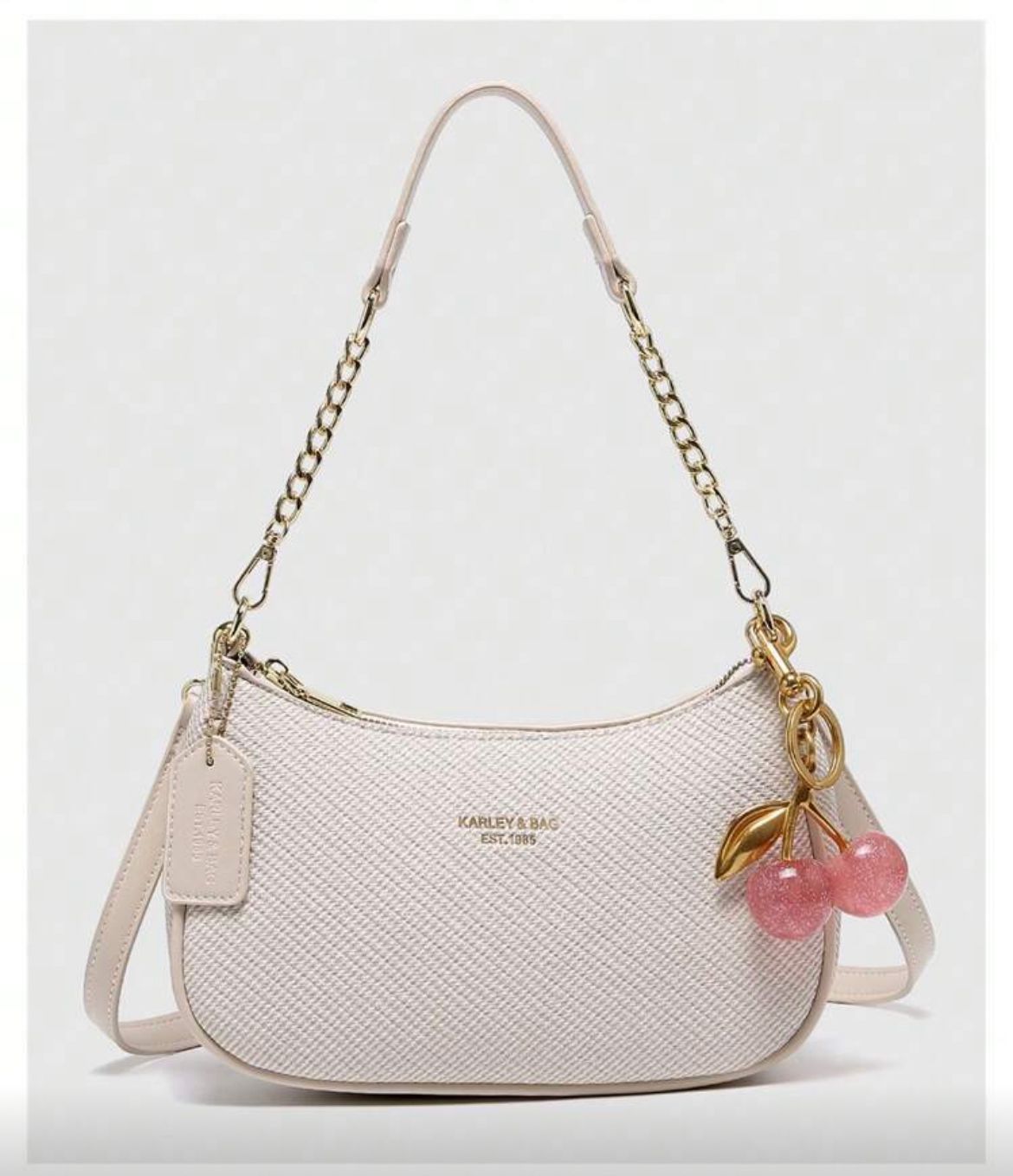 BOLSO COLOR BEIGE, CON CORREA DE CADENA DORADA Y LLAVERO INCLUIDO DE CEREZA COLOR ROSA