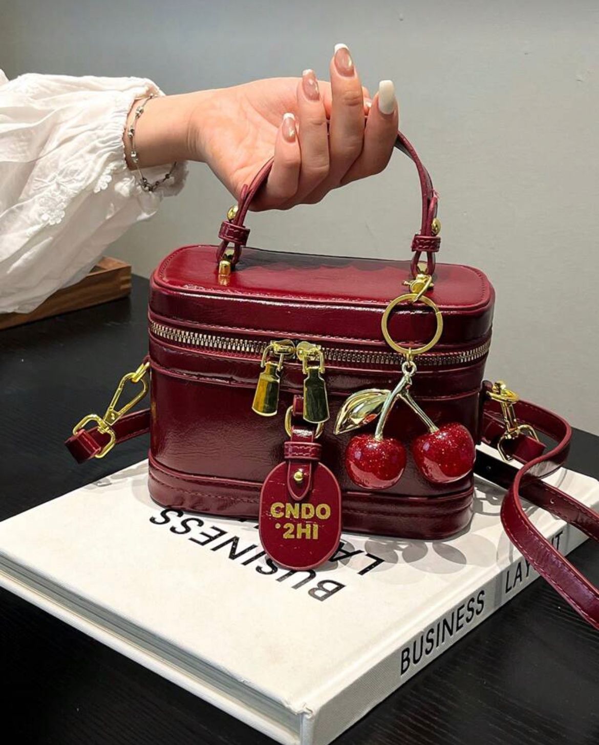 BOLSA TIPO CAJITA COLOR BURDEOS CON LLAVERO DE CEREZAS INCLUIDO Y DETALLES EN COLOR DORADO