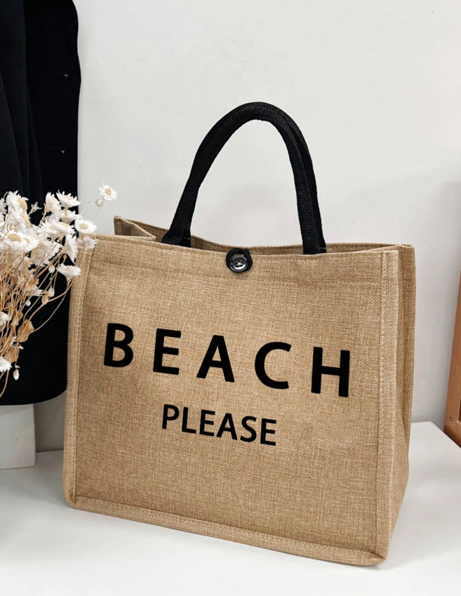 BOLSA CAFE TAMAÑO GRANDE, IDEAL PARA PLAYA CON DISEÑO EN TEXTO EN LA PARTE DEL FRENTE Y AZAS COLOR NEGRO