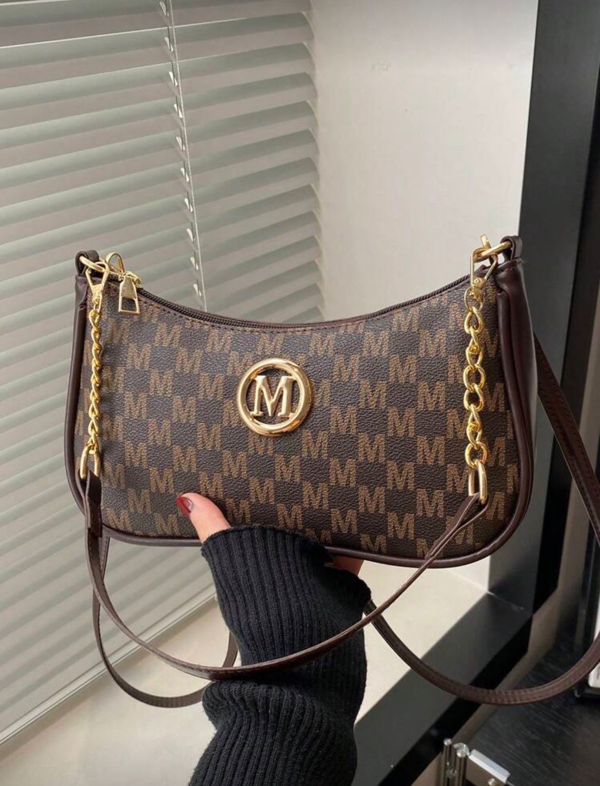 BOLSA CON 2 TONALIDADES DE CAFE Y DETALLES EN COLOR DORADO