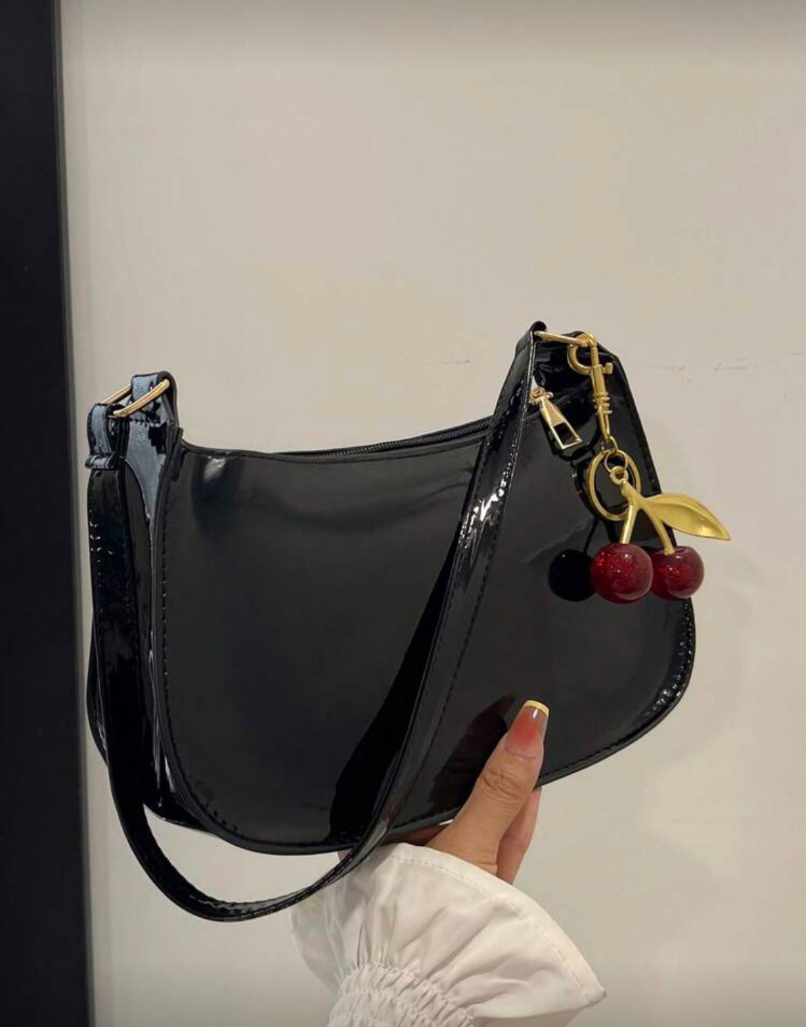 BOLSO NEGRO AL HOMBRO, CON LLAVERO DE CEREZA INCLUIDO, DETALLES Y CIERRES DORADOS