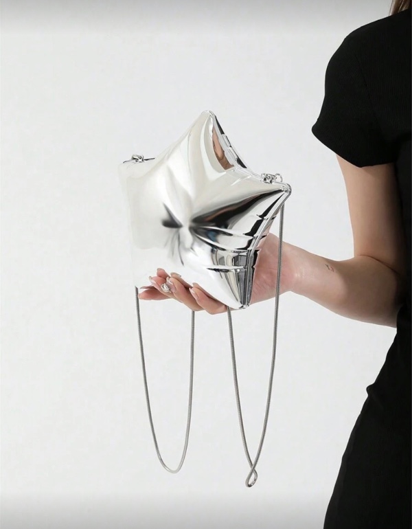 BOLSA EN FORMA DE ESTRELLA Y CADENA LISA EN COLOR PLATA.