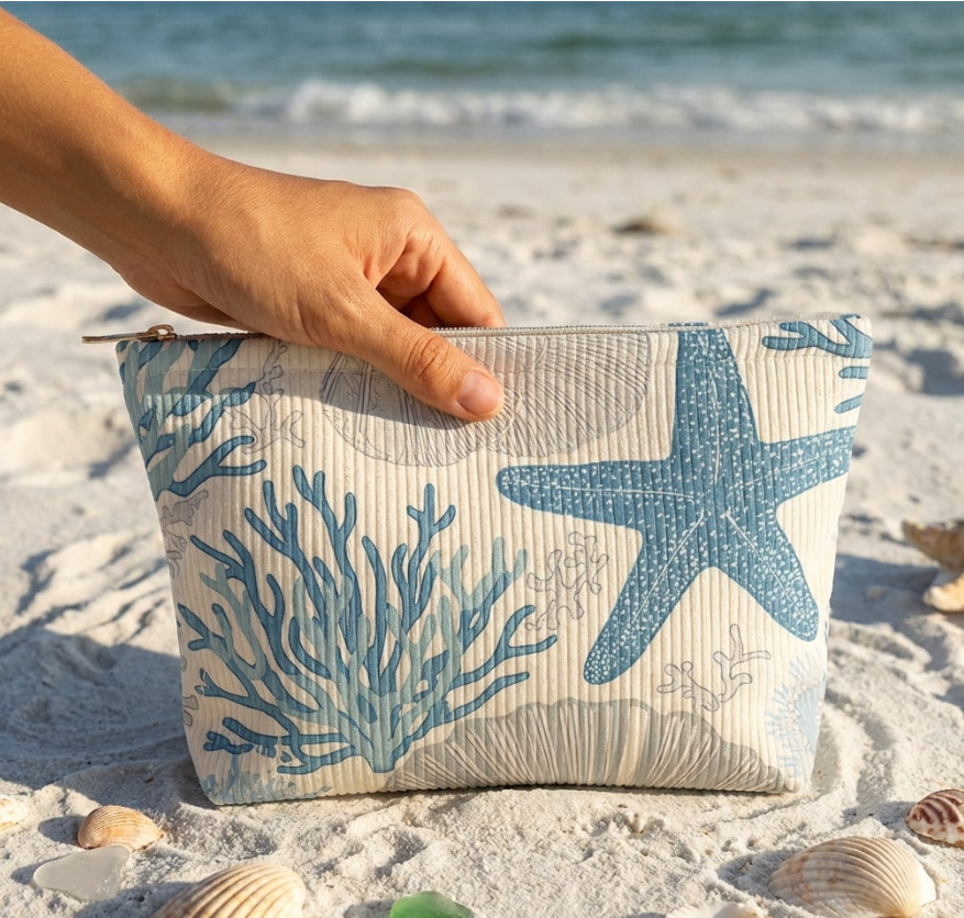 BOLSO DE MANO CON DISEÑO DE ESTRELLAS DE MAR EN TONO AZUL