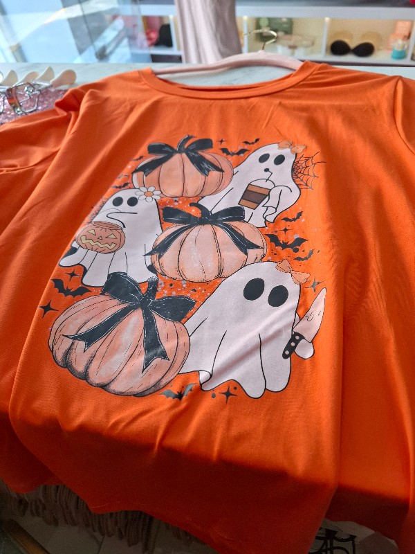 COLOR NARANJA CON DISEÑOS DE CALABAZAS CON FANTASMAS ANIMADOS.