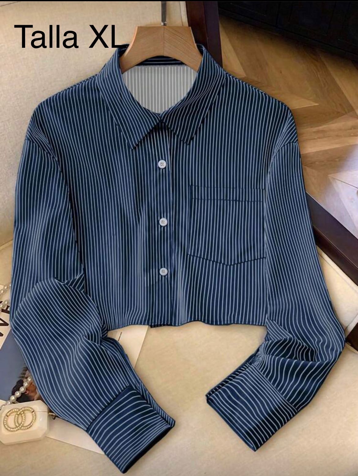 CAMISA RAYADA COLOR AZUL, CON BOTONES BLANCOS Y CUELLO DE MANGA LARGA