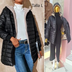 NEGRA Y ABOREGADA COLOR BEIGE CON GORRO Y LARGA.