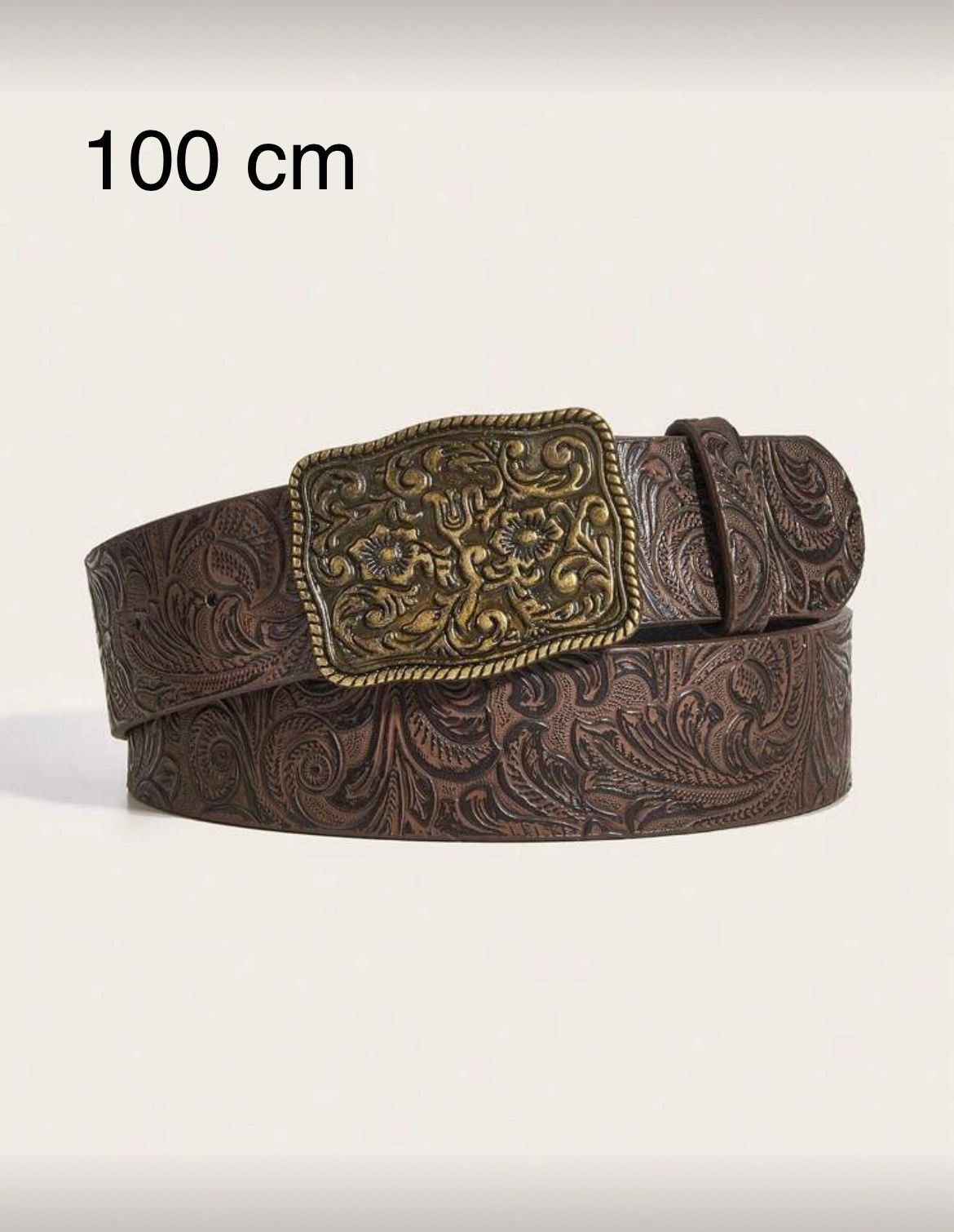 CINTO GRABADO CAFE OSCURO CON HEBILLA DORADA DE FLORES