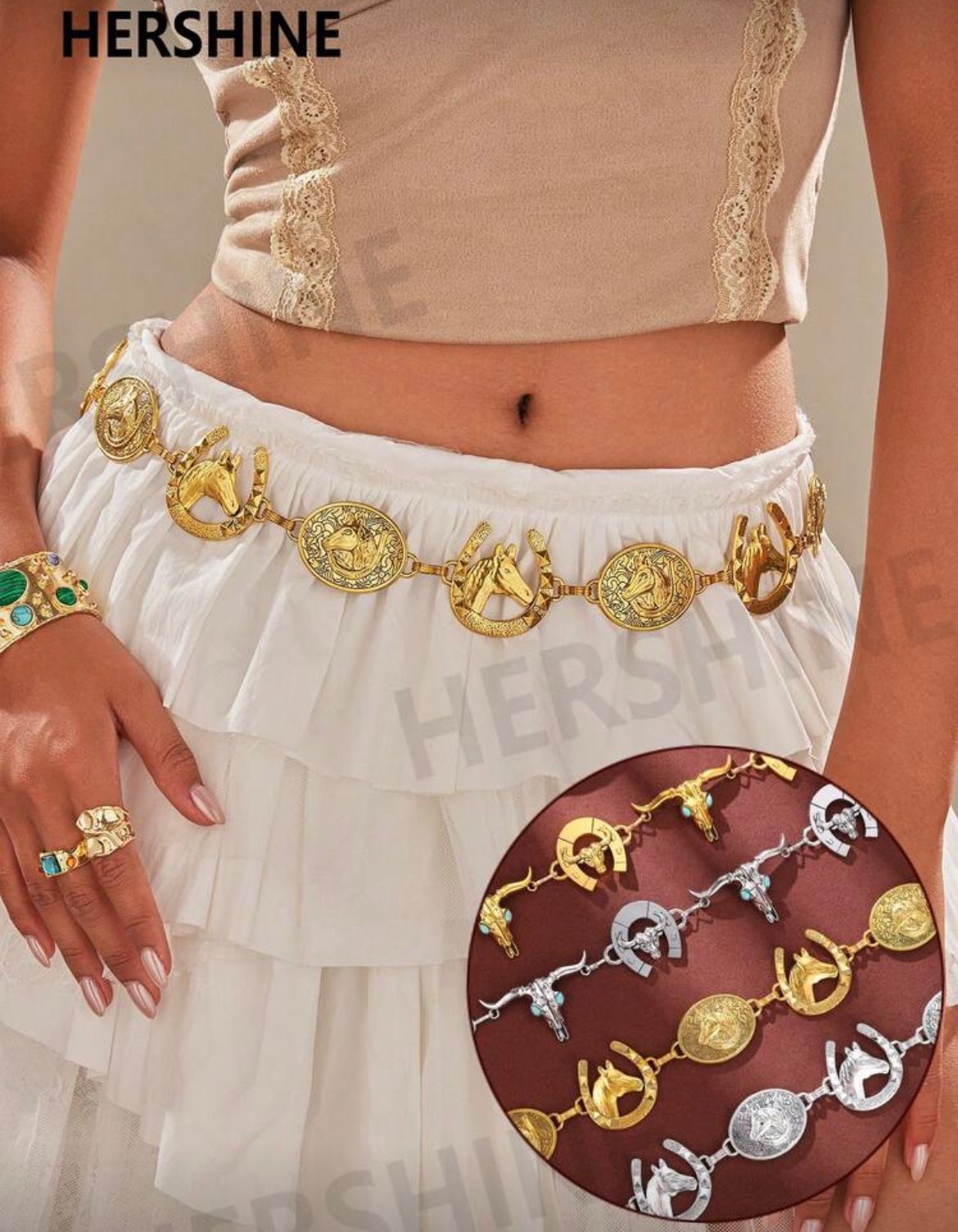 CINTO DE CADENITA CON DISEÑO DE CABALLOS EN LAS HEBILLAS COLOR DORADO