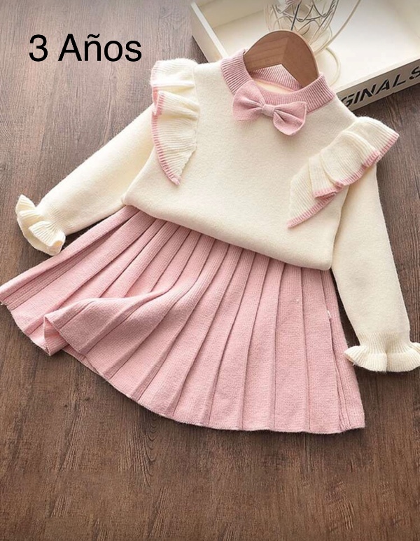 TALLA 3 AÑOS, FALDA COLOR ROSA Y SUETER BLANCO CON ACCESORIOS DE MOÑOS ROSITA.