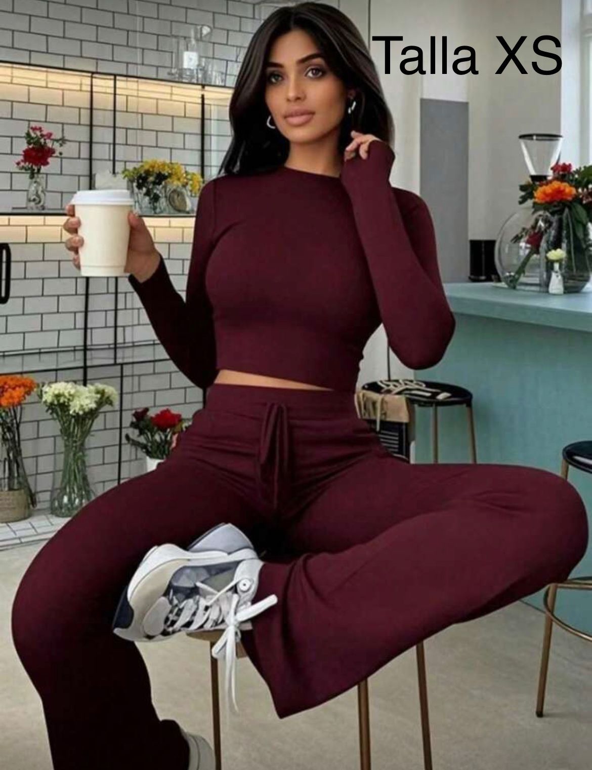 CONJUNTO DEPORTIVO DE MUJER DE TEMPORADA OTOÑAL CON TOP DE MANGA LARGA Y PANTALONES ACAMPANADOS DE AJUSTE CEÑIDO CON CORDONES, COLOR BURDEOS