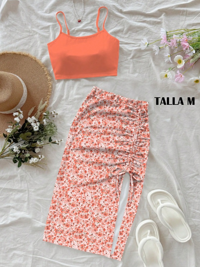 conjunto naranja floreado con falda larga
