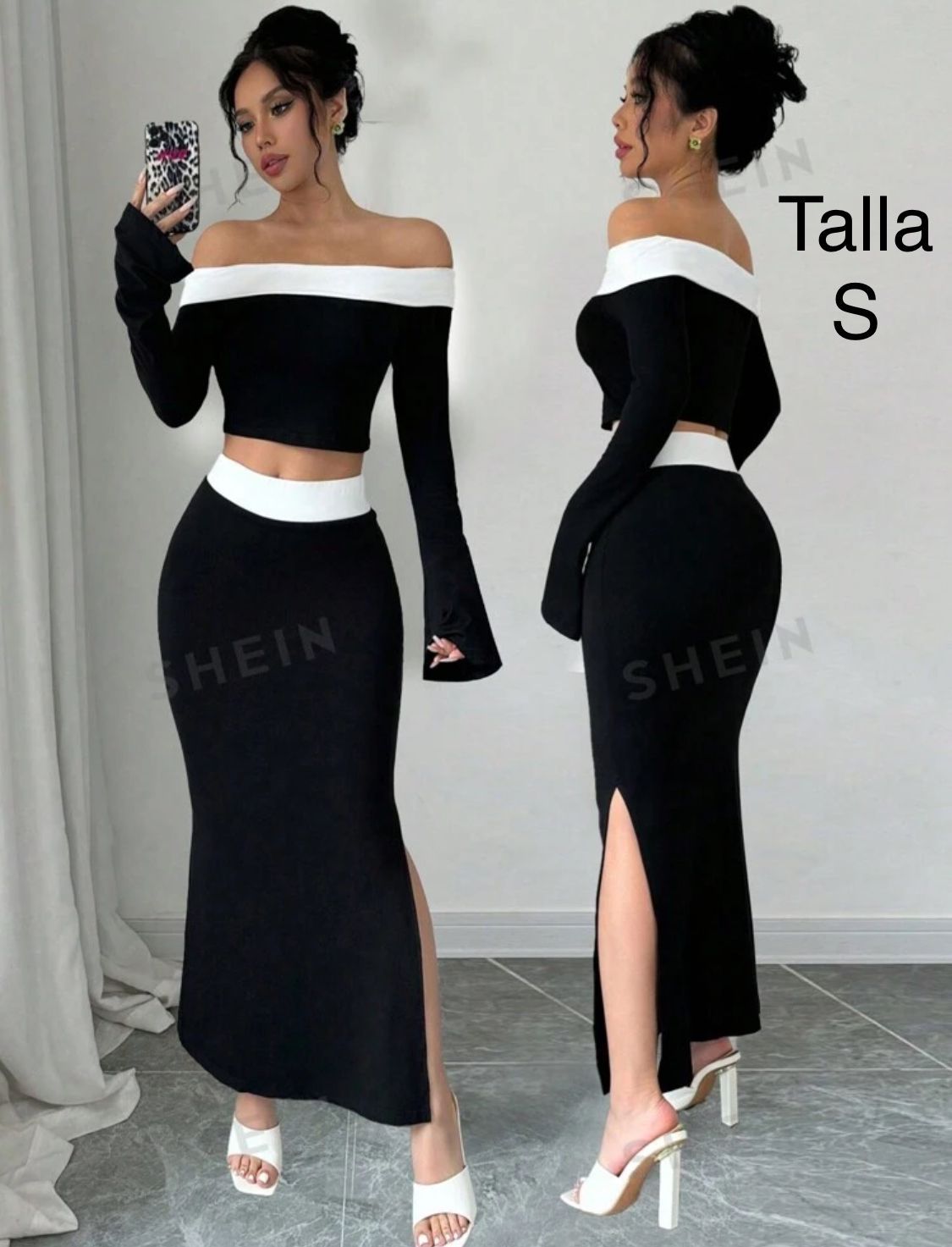 CONJUNTO DE TRAJE DE CAMISETA CORTA ELEGANTE CON BLOQUE DE COLOR, FUERA DEL HOMBRO Y FALDA DE COLA DE PEZ CON ABERTURA LATERAL