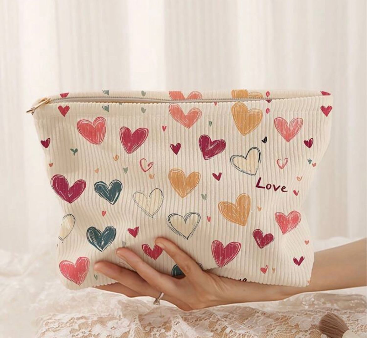 COSMETIQUERA BEIGE CON DISEÑO DE CORAZONES DE DIFERENTES COLORES