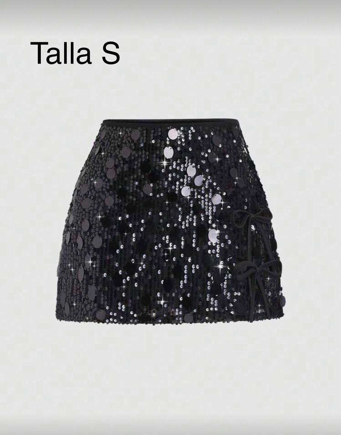 FALDA CORTA DE LENTEJUELAS, COLOR NEGRO CON DETALLES DE MOÑITOS TALLA: S