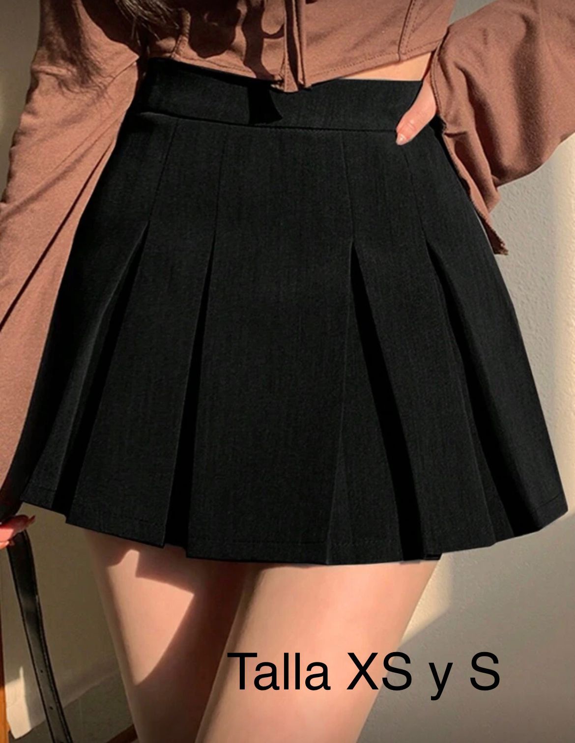 FALDA CORTA PLISADA, NEGRA CON PASTELONES