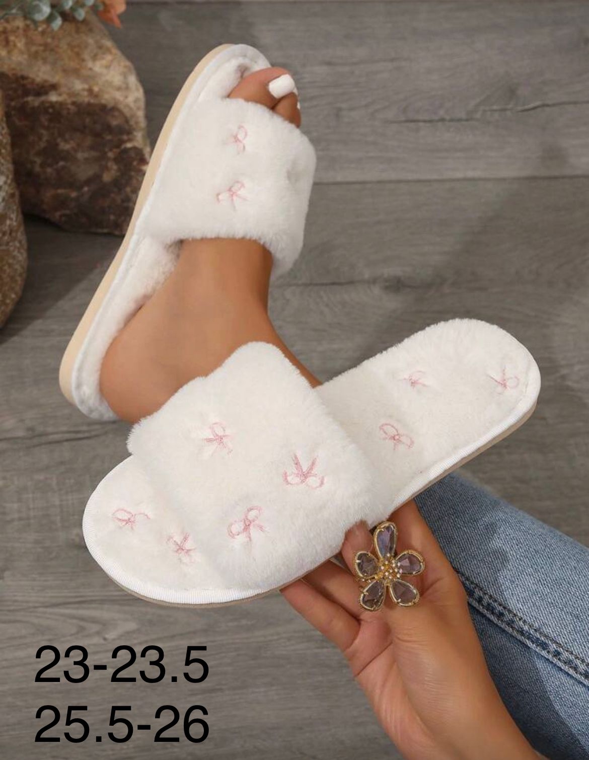 PANTUFLA BLANCA AFELPADA TIPO SANDALIA CON ESTAMPADO DE MOÑITOS ROSAS