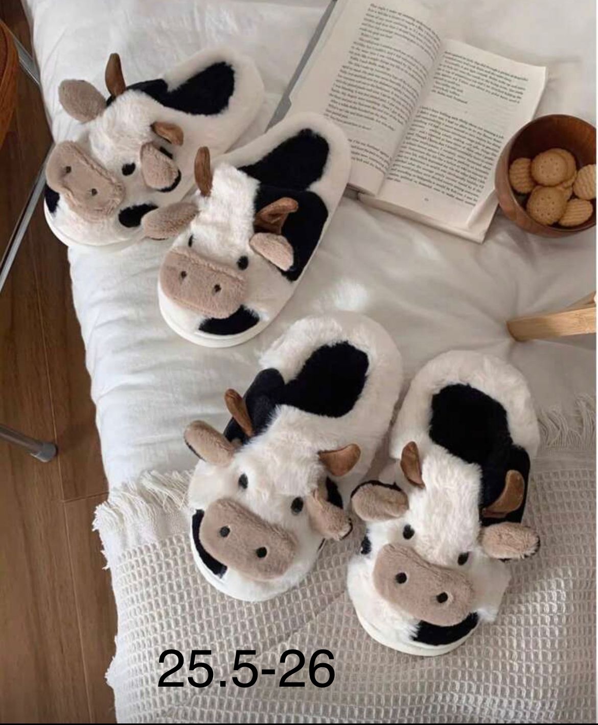 Pantuflas de vaquita de color blanco, negro y cafe, afelpadas