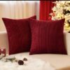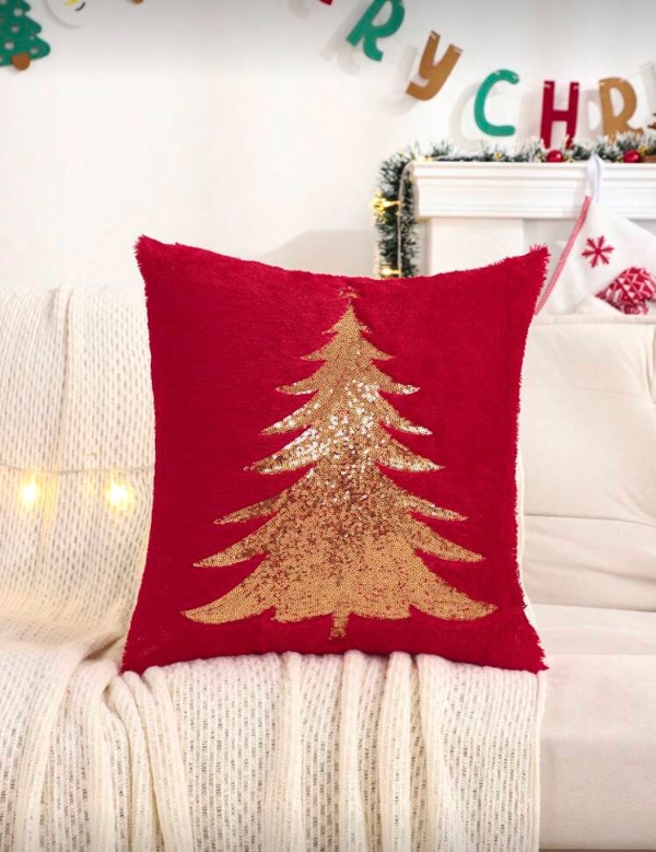 FUNDA PARA COJIN EN COLOR ROJO CON DISEÑO DE UN PINO COLOR DORADO.