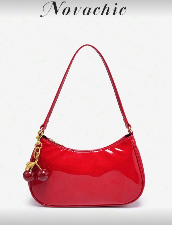 BOLSA ROJA BRILLANTE Y LISA CON ACCESORIO DE CEREZA COLOR BURDEOS Y CON BRILLOS.