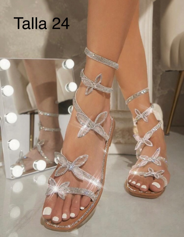 TALLA 24, DE SUELA COLOR NUDE, DE TIRAS PLATEADAS CON MARIPOSAS EN EL DISEÑO.