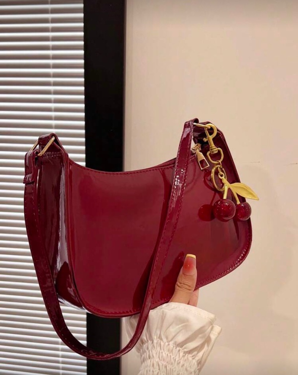 BOLSA COLOR TINTA CON ACCESORIO DE CEREZA BRILLOSA.