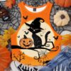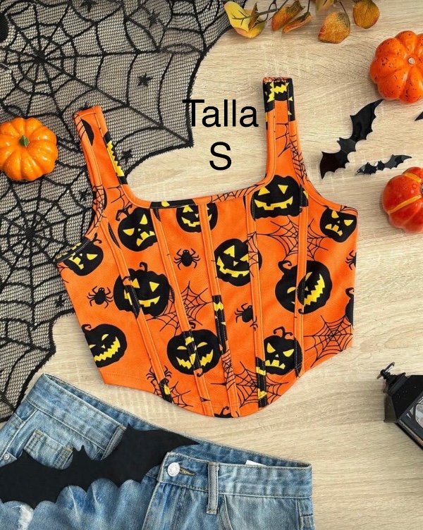 COLOR NARANJA CON DISEÑOS DE CALABAZA Y ARAÑAS COLOR NEGRAS.