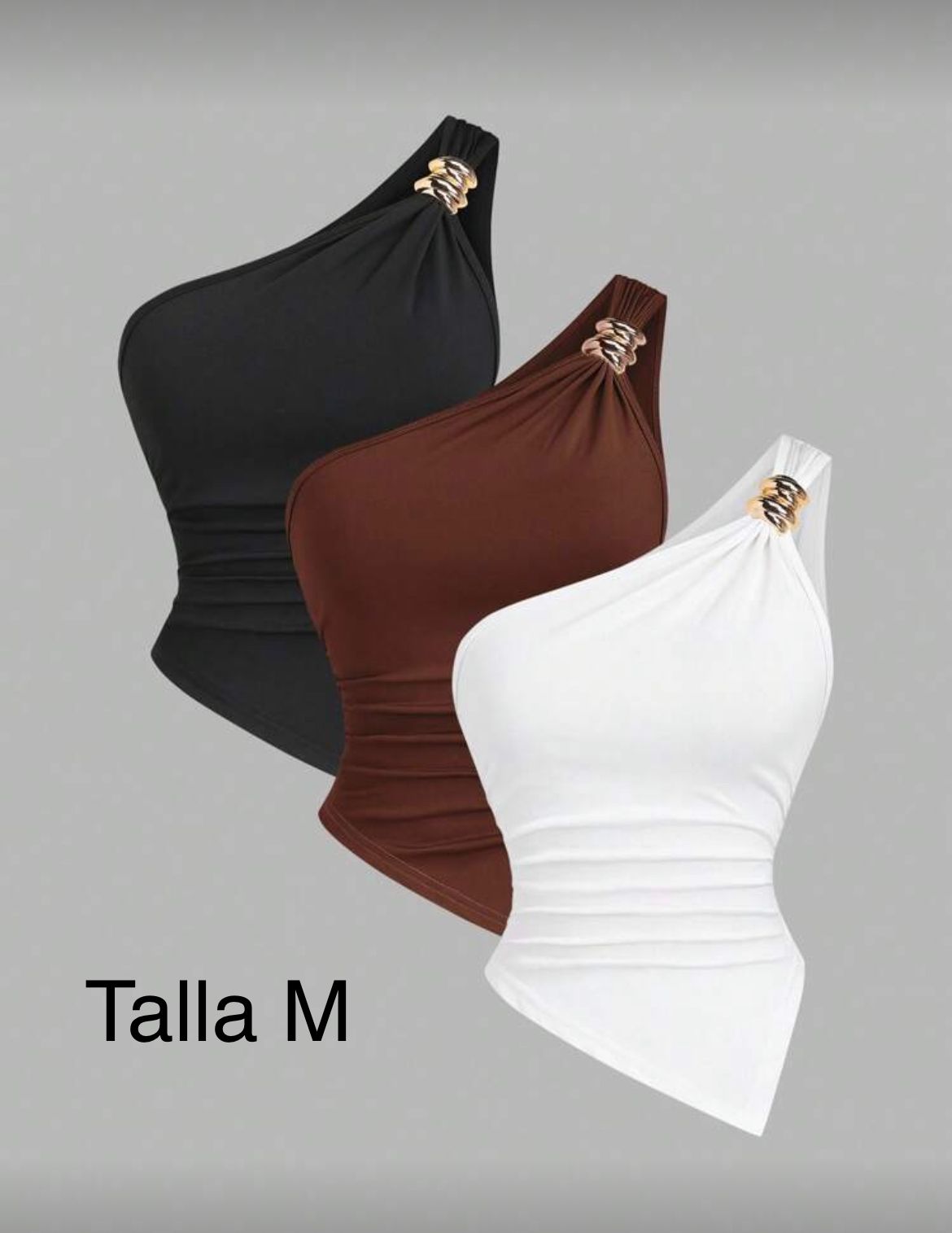 TOPS DE COLOR NEGRO, CAFE Y BLANCO, CON 1 HOMBRO DESCUBIERTO Y DETALLE DORADO
