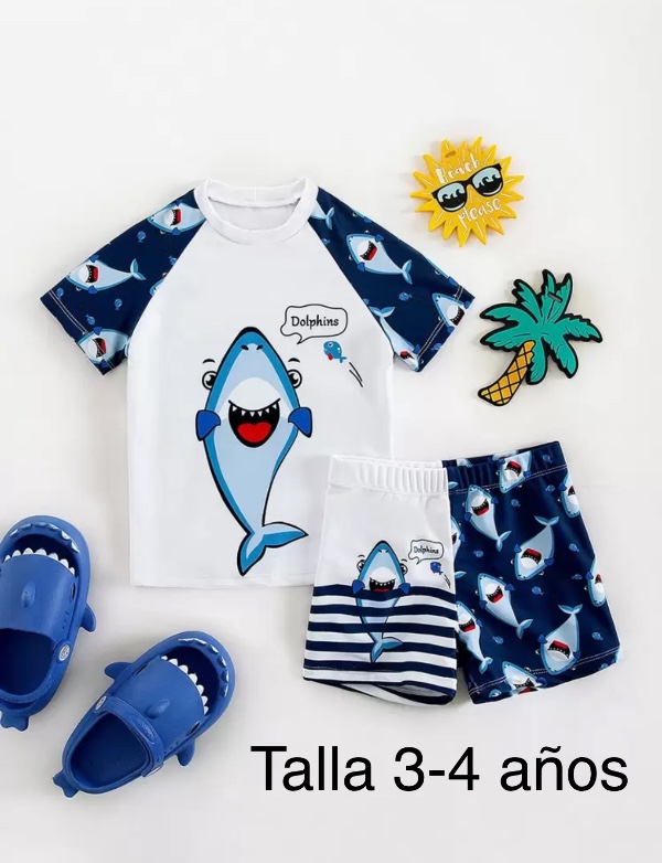 TALLA DE 3-A AÑOS COLOR AZUL CON BLANCO CON DISEÑO DE TIBURON.