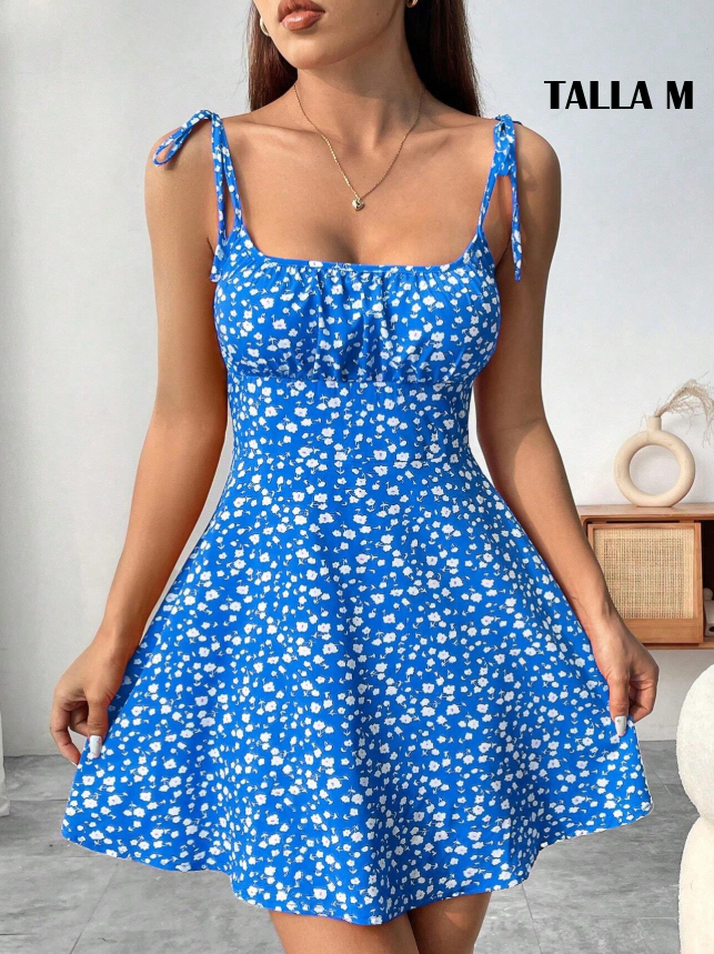 VESTIDO CORTO COLOR AZUL CON FLORES BLANCAS, TALLA M