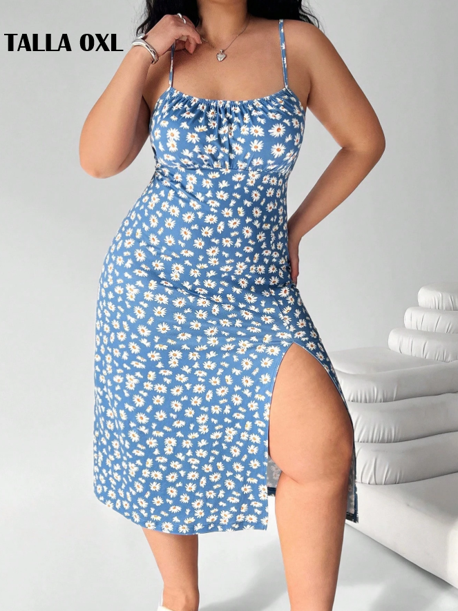 VESTIDO AZUL CURVY FLOREADO DE TIRANTES CON ABERTURA EN LA PIERNA