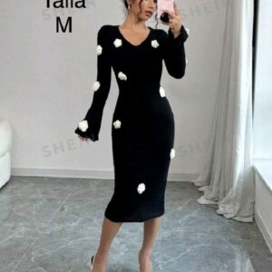 LARGO,CON FLORECITAS BLANCAS POR TODO EL VESTIDO.