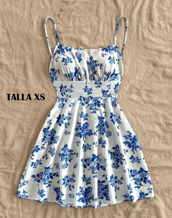 VESTIDO CORTO BLANCO CON DISEÑO DE FLORES EN COLOR AZUL, TALLA XS