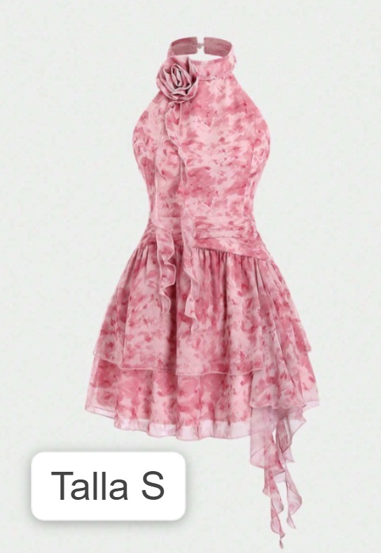 vestido corto rosa con una flor en el cuello