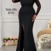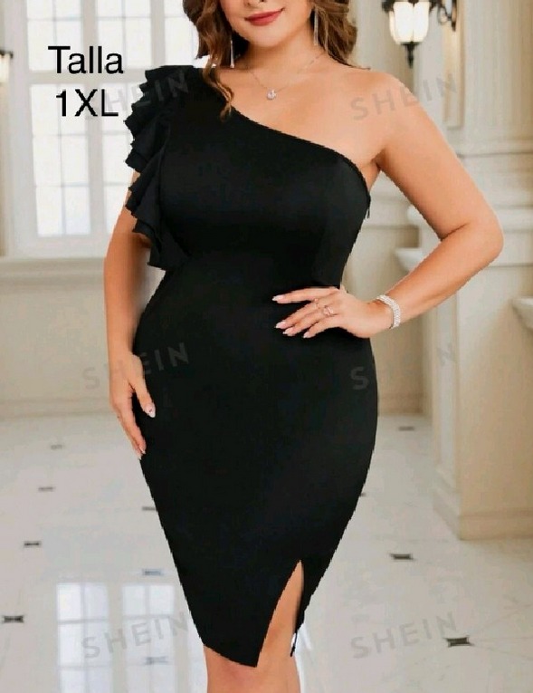 VESTIDO NEGRO, CON HOMBRO DESCUBIERTO Y DETALLE EN HOMBRO CON FLORES, ABERTURA CORTA EN PIERNA