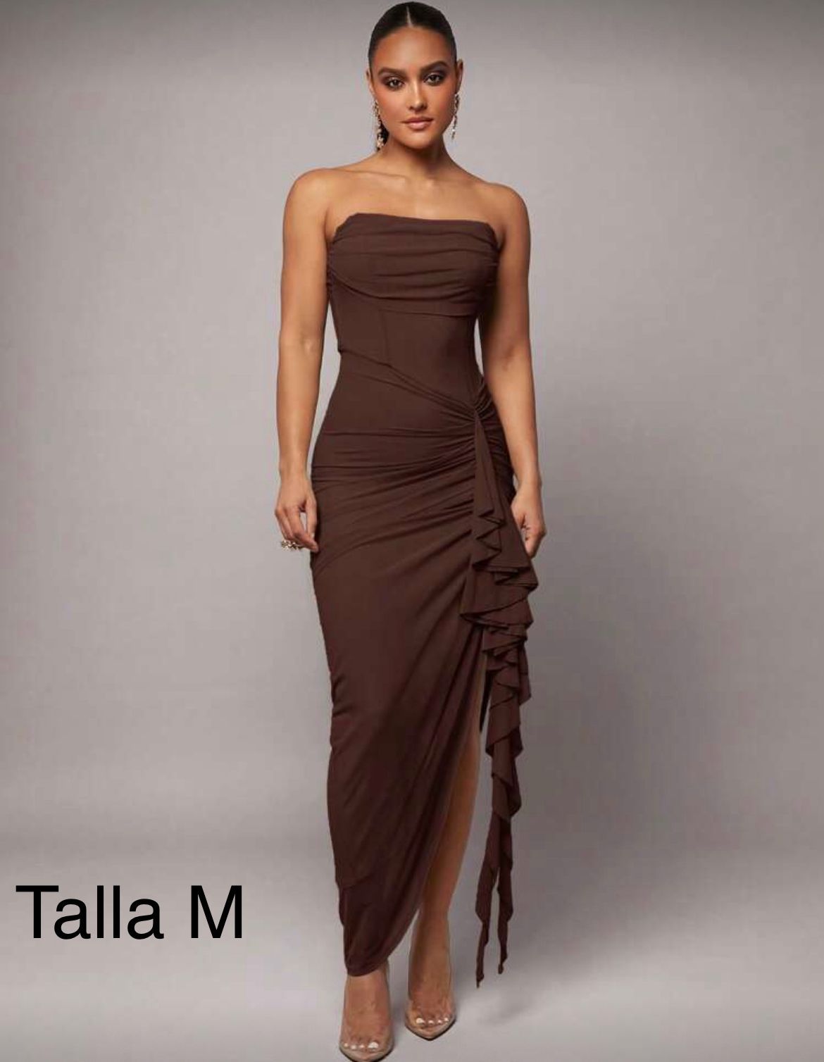 VESTIDO ELEGANTE, SIN MANGAS COLOR CAFÉ INTEGRAL Y ABERTURA ALTA