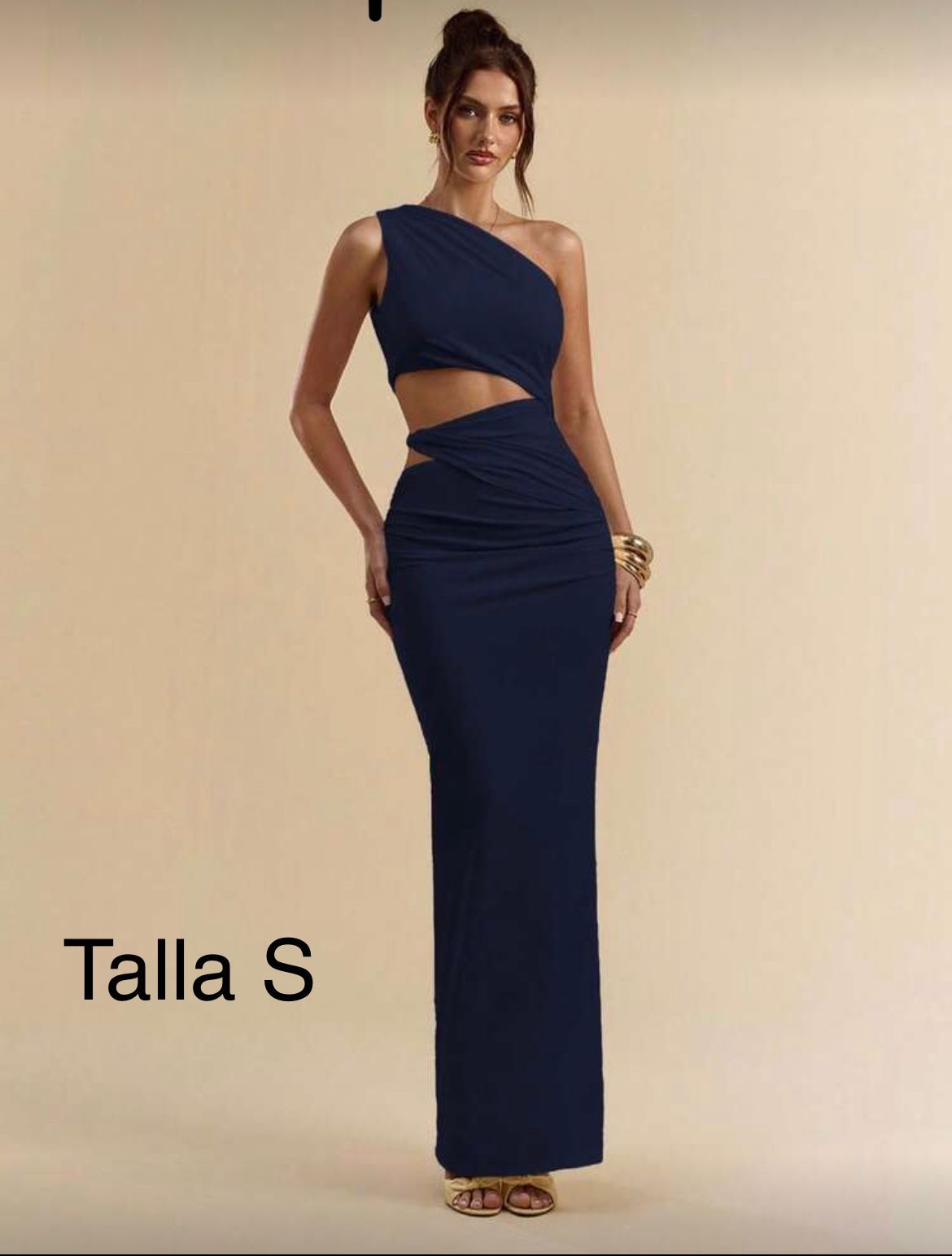 VESTIDO COLOR AZUL MARINO, ASIMETRICO FRUNCIDO DE CUERPO Y CEÑIDO CON ABERTURA ALTA