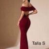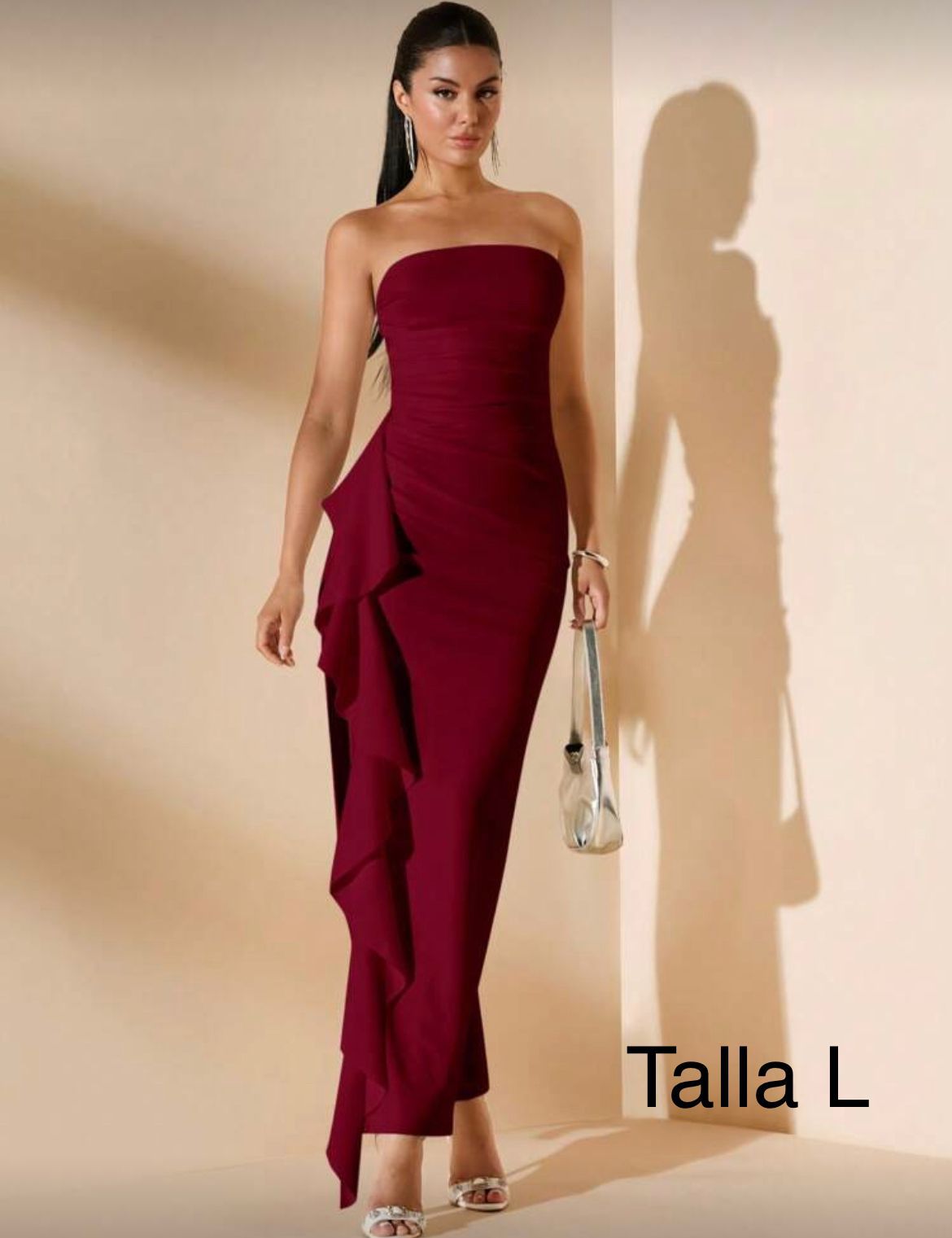VESTIDO LARGO COLOR BURDEOS SIN MANGAS NI TIRANTES, CON PLIEGUES Y ABERTURA ALTA