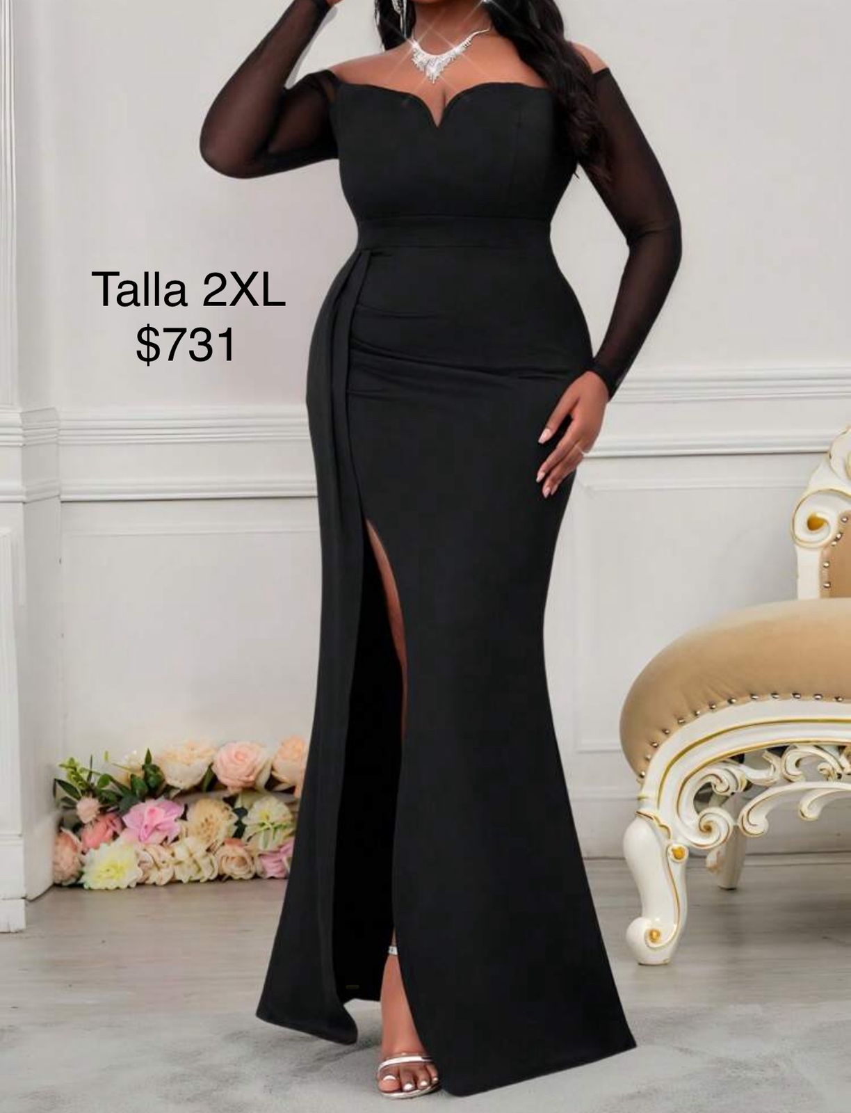 VESTIDO LARGO ELEGANTE, COLOR NEGRO, DE MANGA LARGA Y ESCOTE CORAZÓN, CON ABERTURA EN LA PIERNA