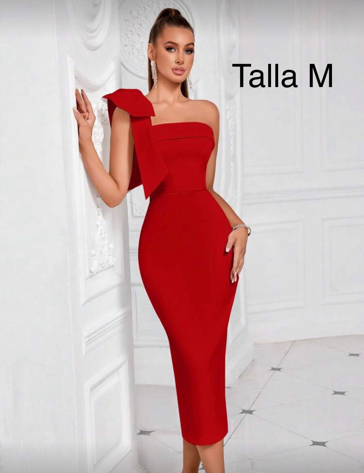 VESTIDO LARGO COLOR ROJO, CON HOMBRO DESCUBIERTO Y DETALLE DE MOÑO