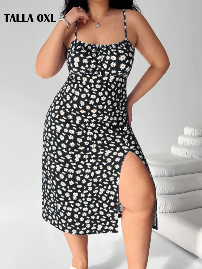 VESTIDO NEGRO CURVY DE TIRANTES CON ABERTUTA EN LA PIERNA Y FLORES BLANCAS