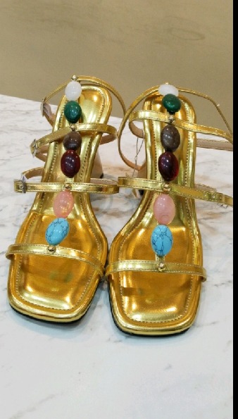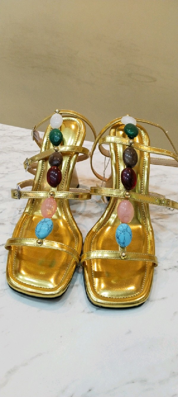 TALLA 24 ,DORADAS CON PIEDRAS DE COLORES Y TIRAS DORADAS ESTILO CUADRADO.